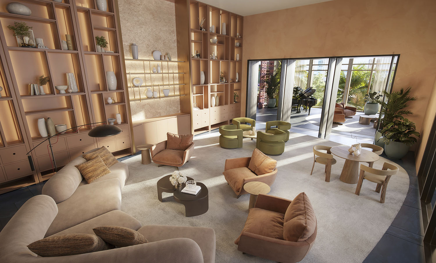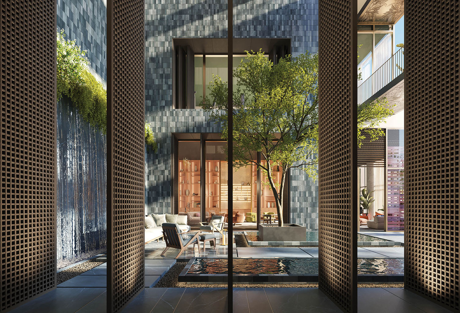 • Lobby and amenity levels by Yabu Pushelberg, immersed in CLAD-designed tropical landscaping and sculpture gardens.