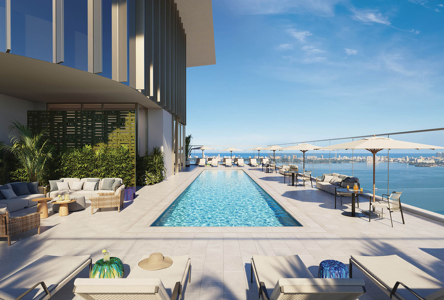 • Rooftop skydeck on level 49 with panoramic pool, sunset lounge and sky bar, archive library, and private dining room with catering pantry.